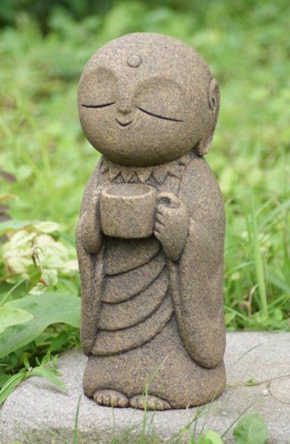 In het zachte groen van de tuin staat een klein stenen beeldje, stil en tevreden. Het stelt een eenvoudige monnik voor, met gesloten ogen en een lichte glimlach op zijn gezicht. In zijn handen houdt hij een klein kopje vast, alsof hij rustig geniet van een warm moment van stilte.